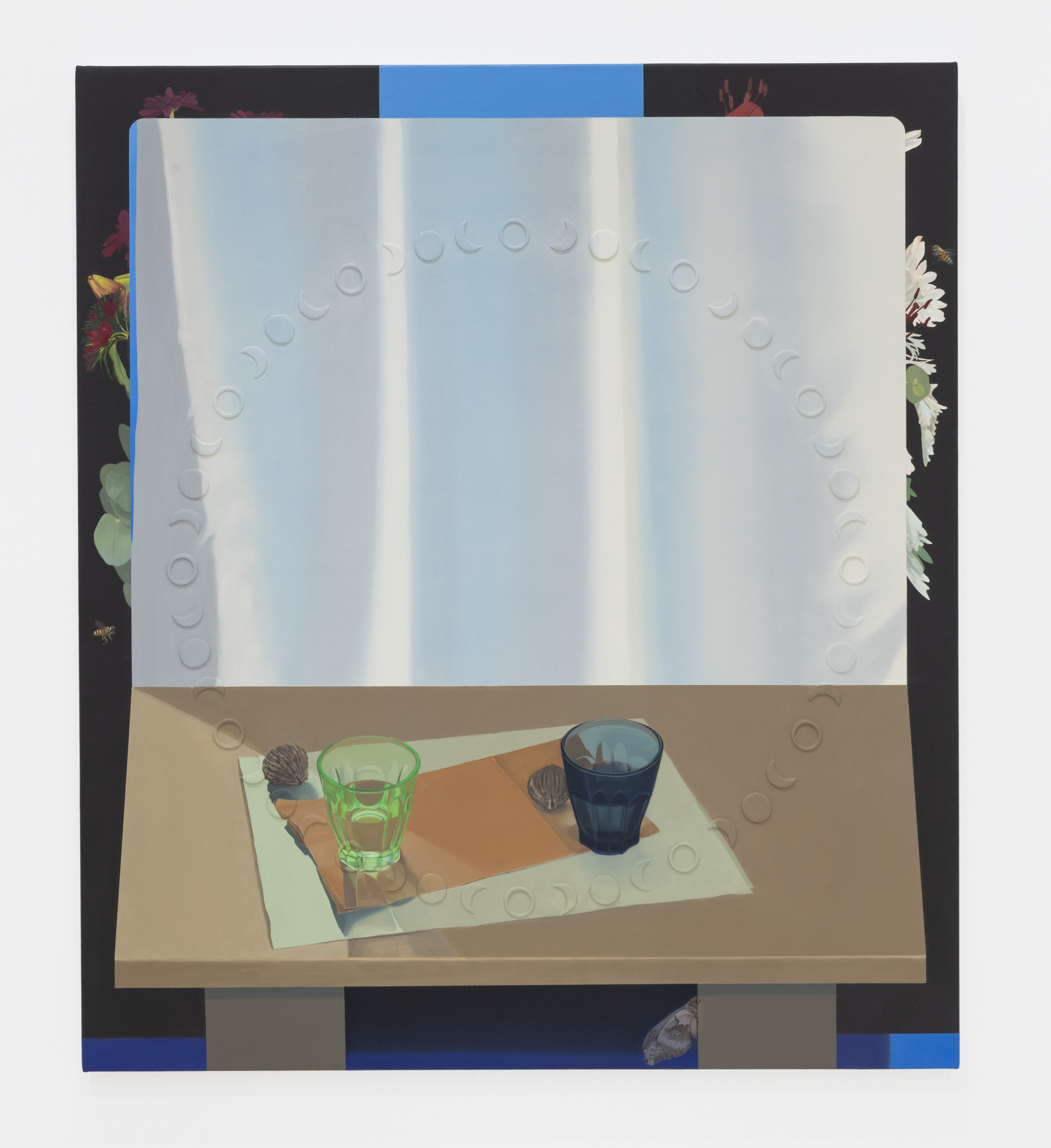 Sarah Pater, Two glasses of water (window view, relief), 2024, oil and wax on linen, 32 x 28 inches